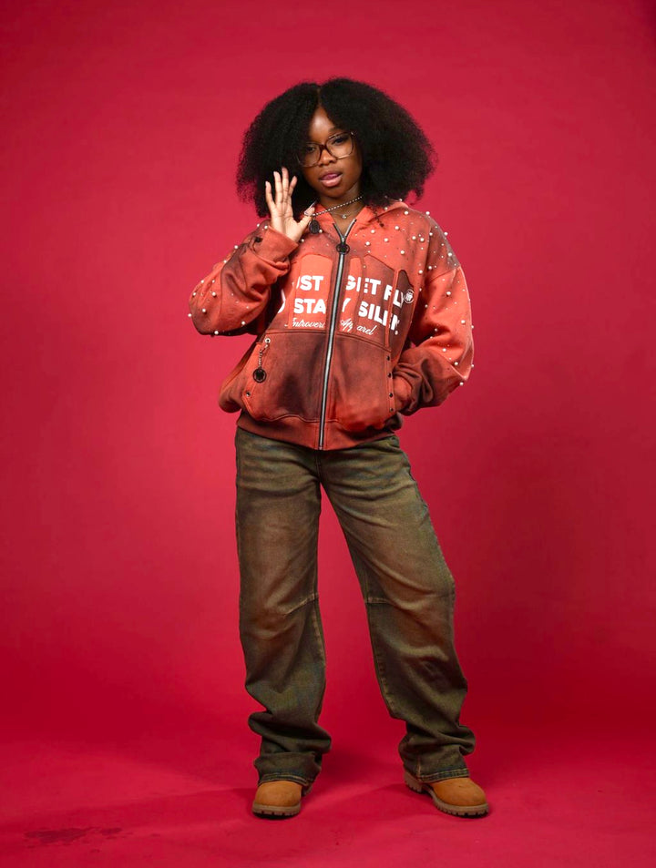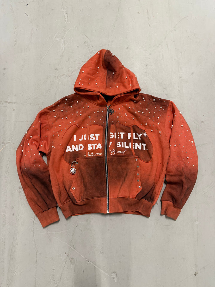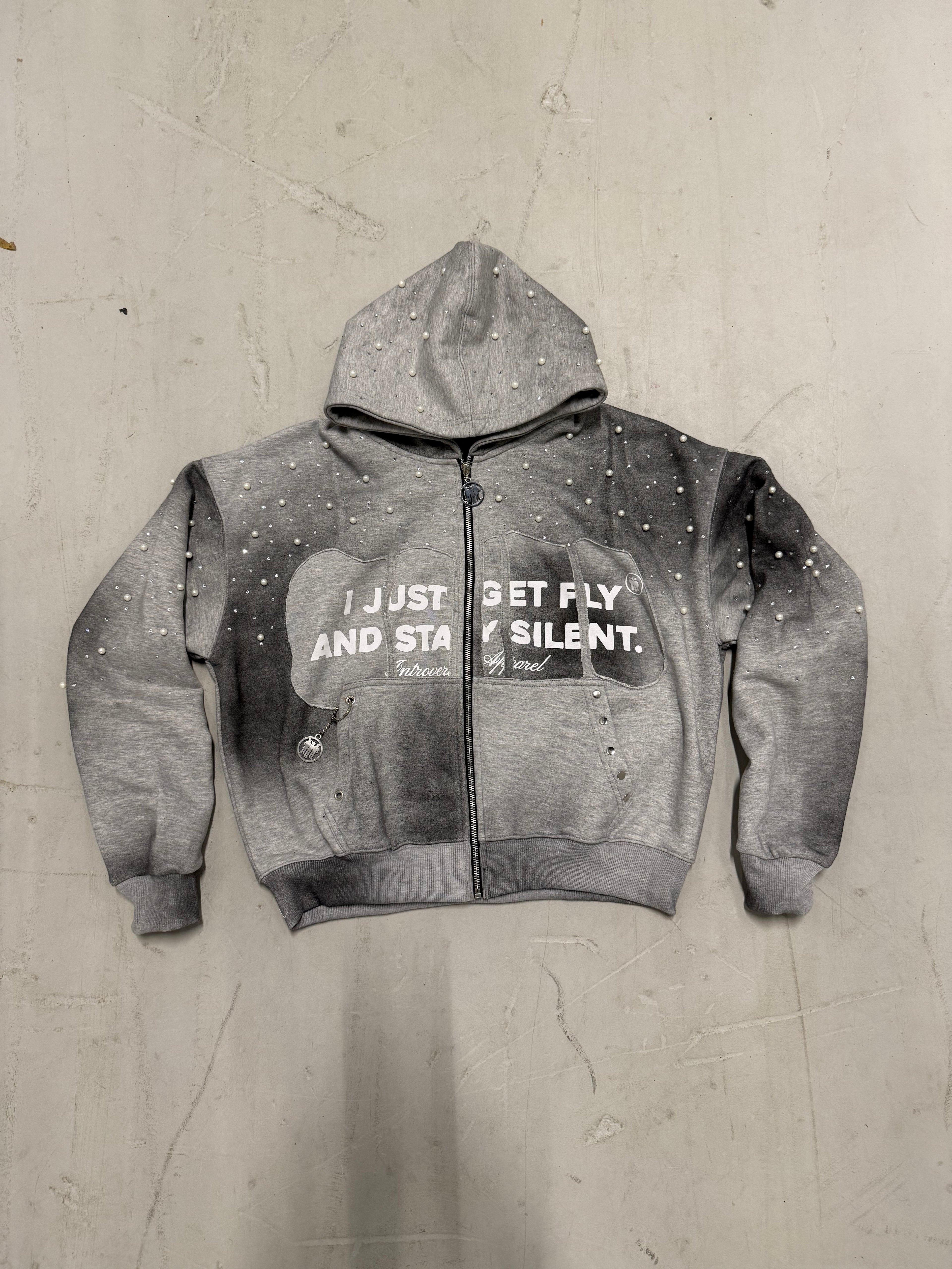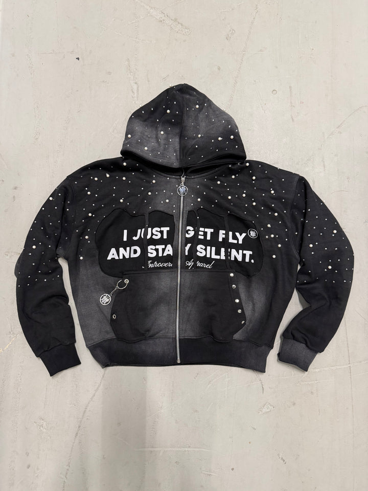 Each Silent Shiner Zip Up is handcrafted from a premium heavyweight cotton blend that’s soft, structured, and built to last. It’s detailed with VVS diamond rhinestones and pearl accents, making every piece shimmer with quiet power.